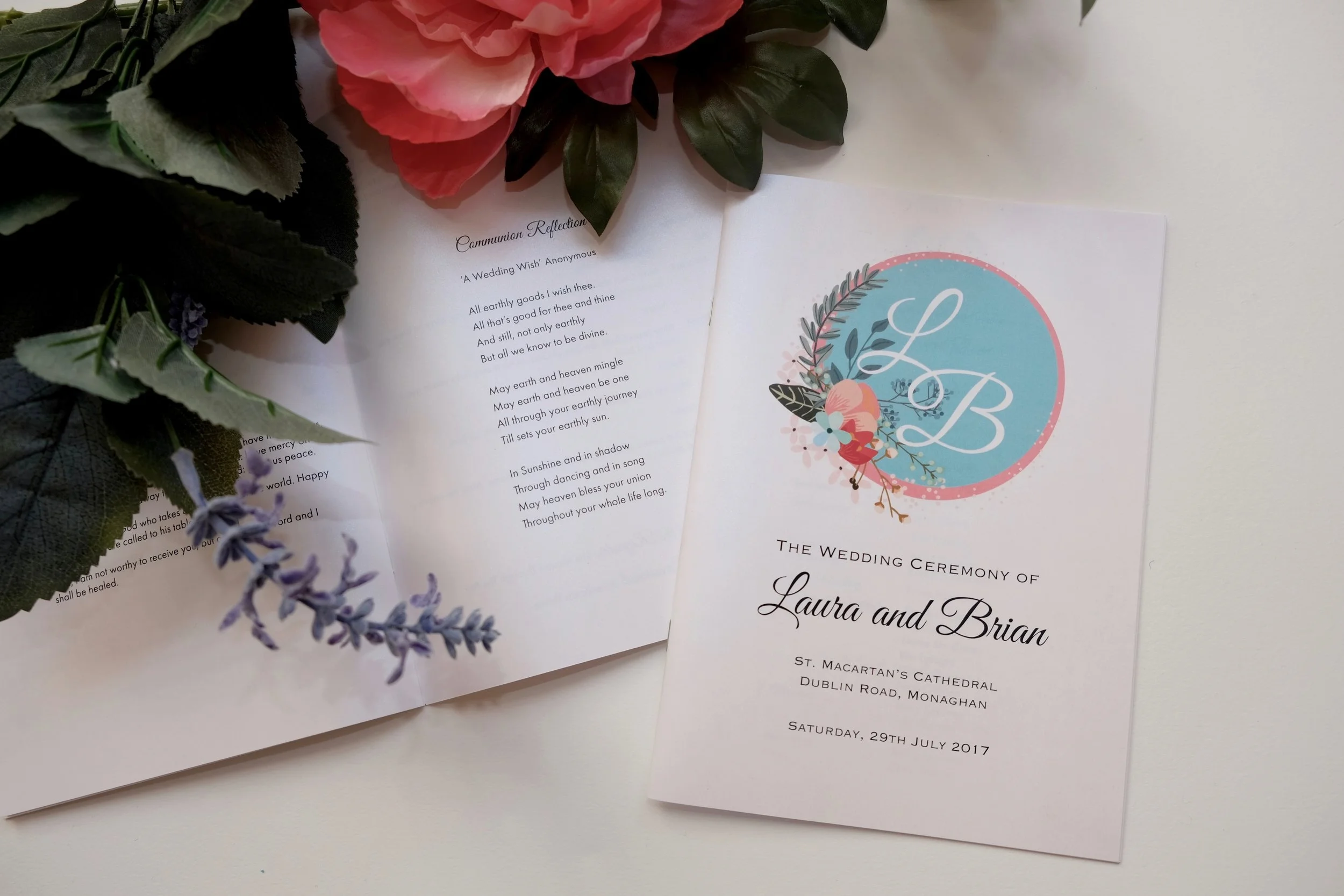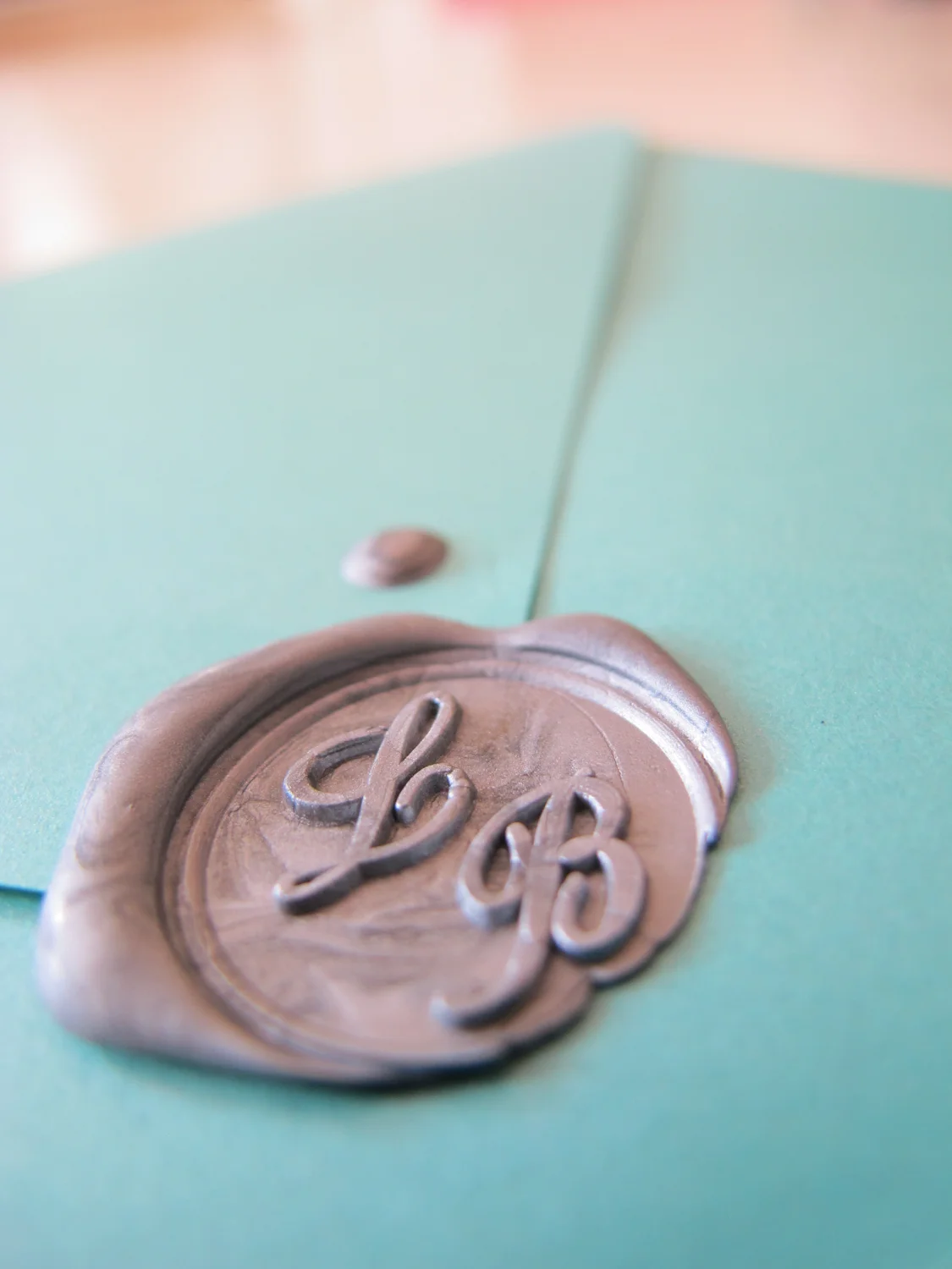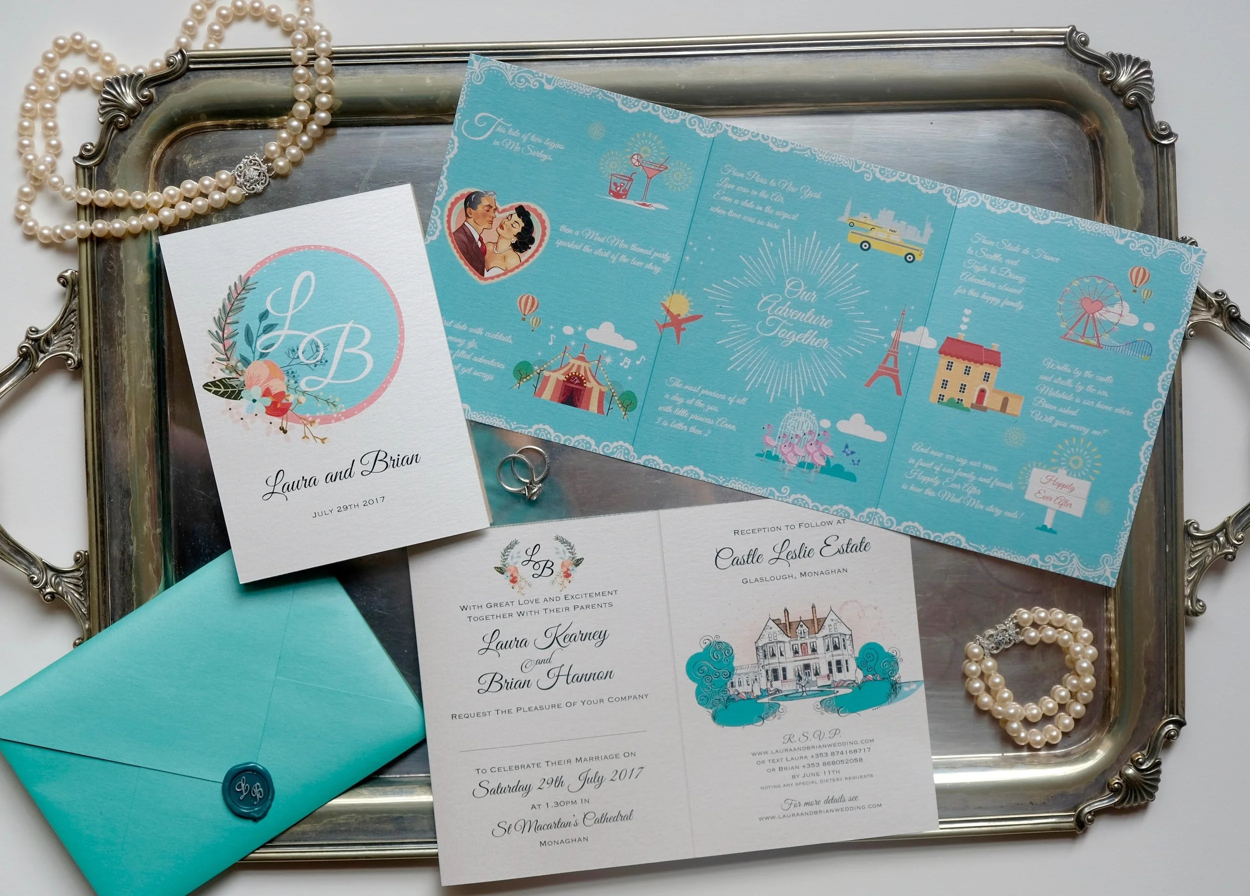 The Invitation itself is a trifold on pearly card, with a monogram of our initials L and B intertwined on the front against some of our favorite colours. Inside we have an illustration of our wedding venue, the beautiful and charming Castle Leslie. With an illustrated poem on the back describing how we first met and the adventure that brought us on to our wedding day. Every word and design element is personal to us and reflects us in some way. Even the wax seal stamp was purchased on a precious family holiday in the south of Italy in a quaint little artisan paper shop.