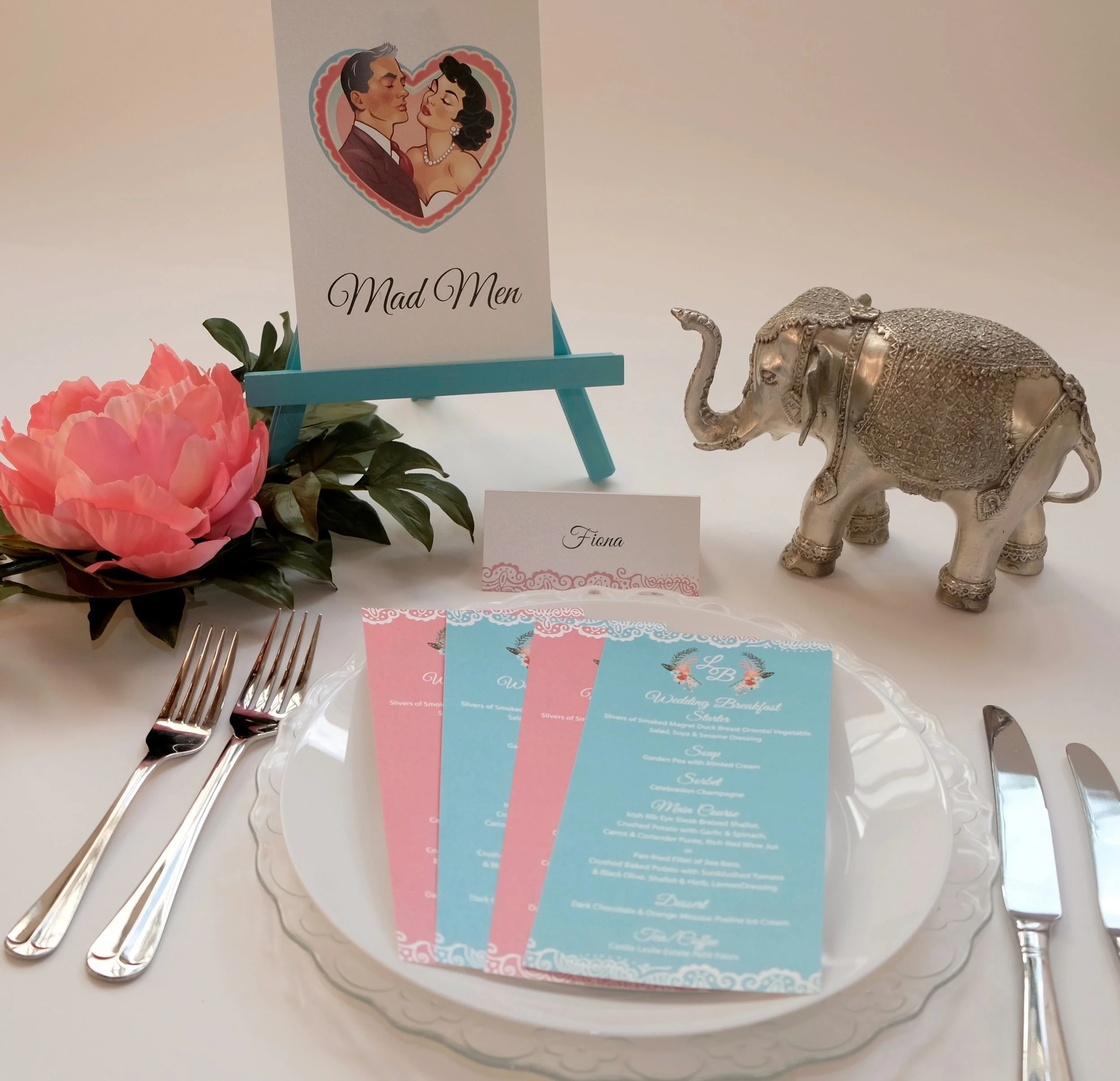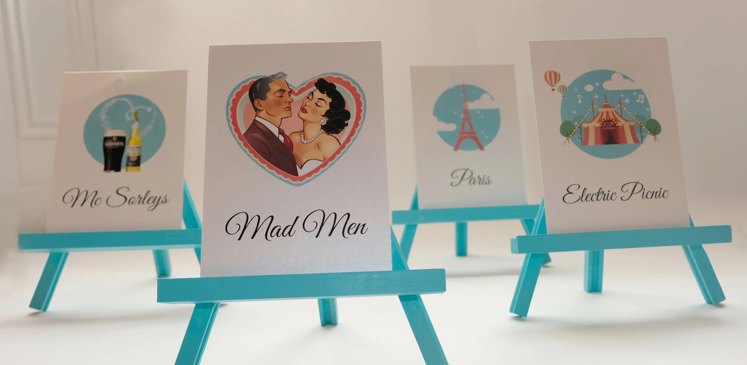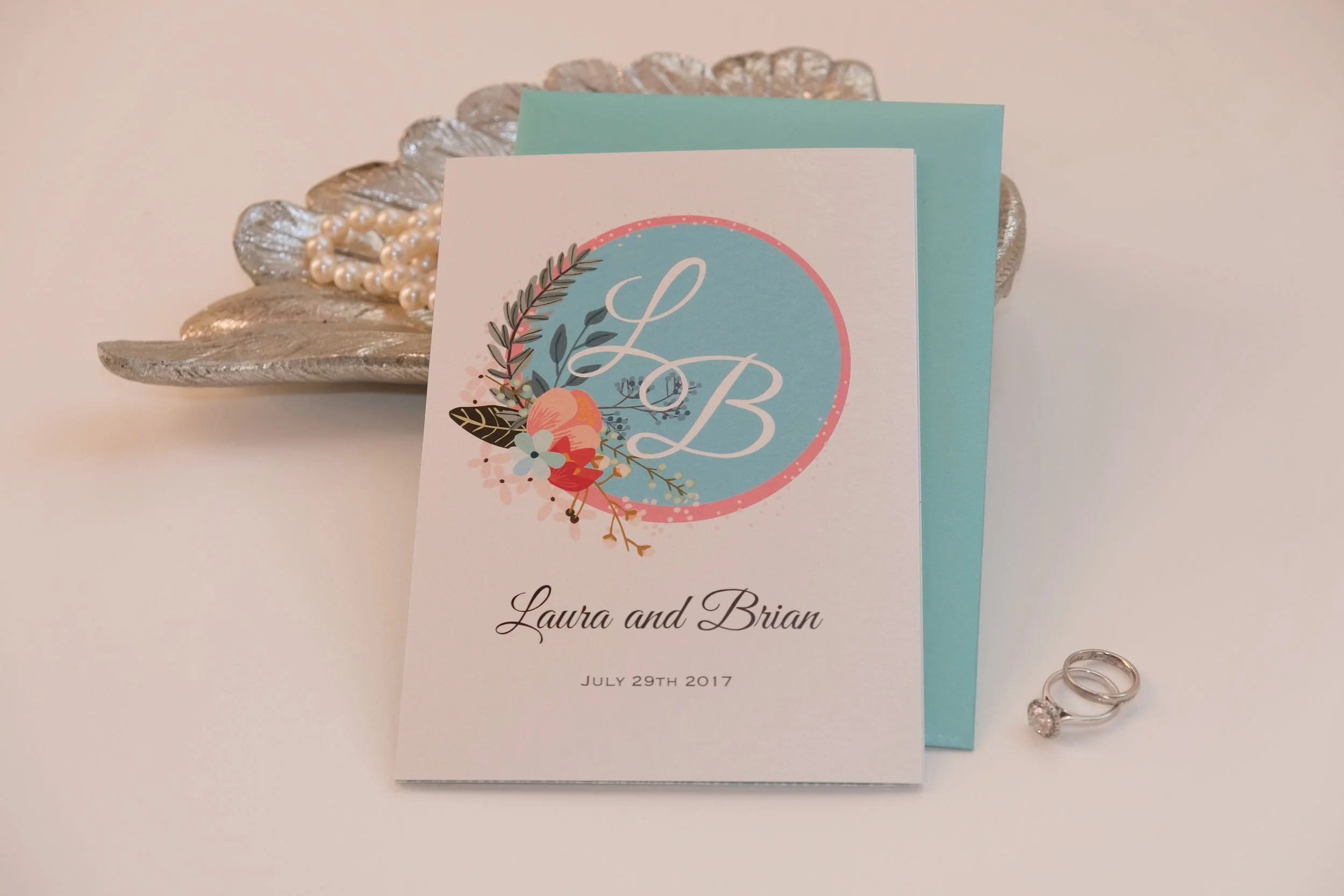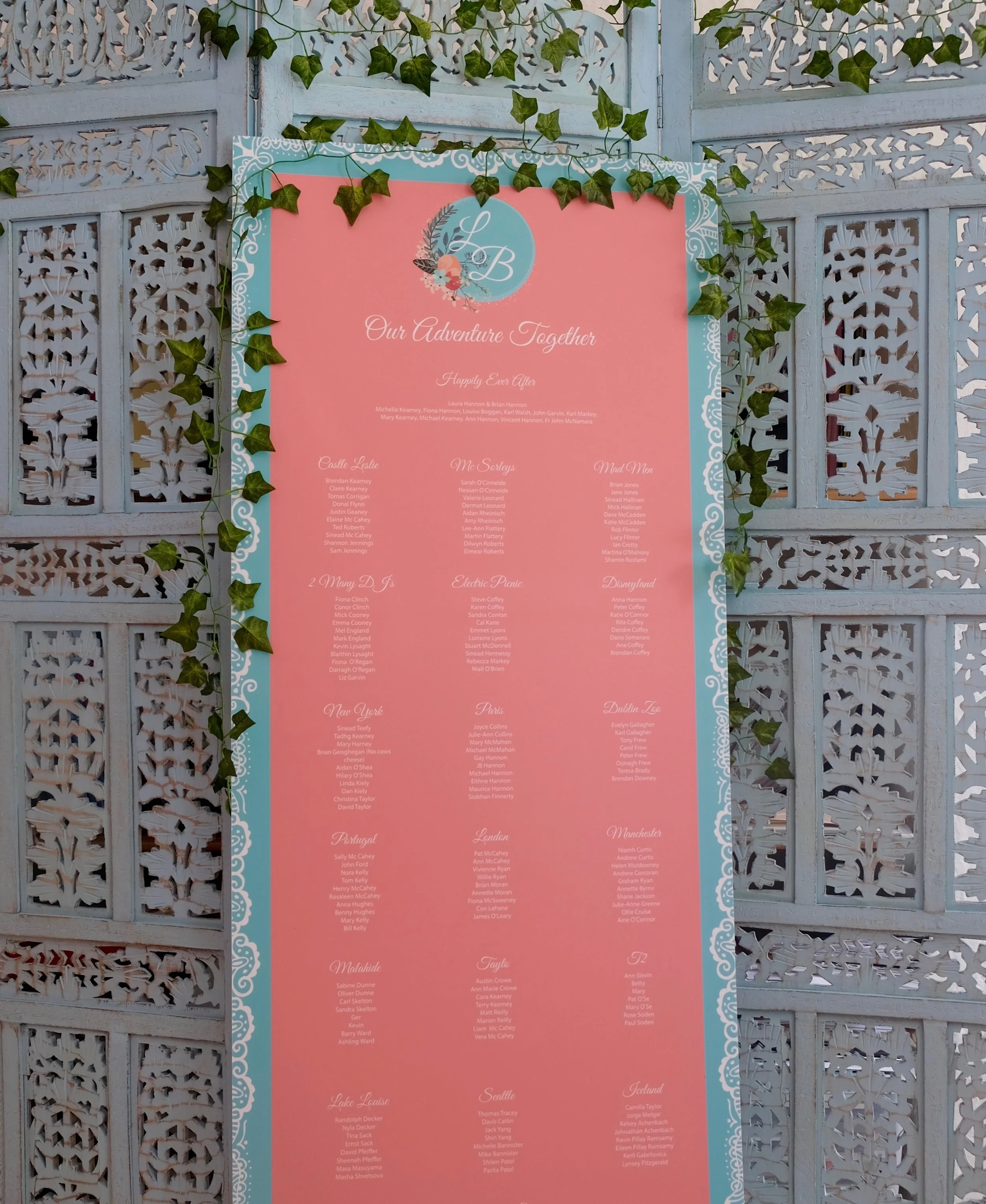 The Invitation itself is a trifold on pearly card, with a monogram of our initials L and B intertwined on the front against some of our favorite colours. Inside we have an illustration of our wedding venue, the beautiful and charming Castle Leslie. With an illustrated poem on the back describing how we first met and the adventure that brought us on to our wedding day. Every word and design element is personal to us and reflects us in some way. Even the wax seal stamp was purchased on a precious family holiday in the south of Italy in a quaint little artisan paper shop.